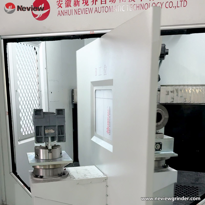 La DR-950B es una rectificadora de un solo brazo y doble estación, desarrollada por Neview Automatic, para piezas de hierro fundido de tamaño mediano a grande. Gracias a su tecnología de varillaje de 8 ejes y su configuración de doble husillo, logra un rectificado de alta precisión y una producción de alta eficiencia. El diseño de la plataforma giratoria de doble estación permite la carga/descarga y el rectificado simultáneos, lo que mejora significativamente la eficiencia de producción. Es ideal para el posprocesamiento, como el desbarbado y el pulido de piezas de hierro de tamaño mediano a grande en maquinaria de construcción, la fabricación de automóviles y otros sectores.